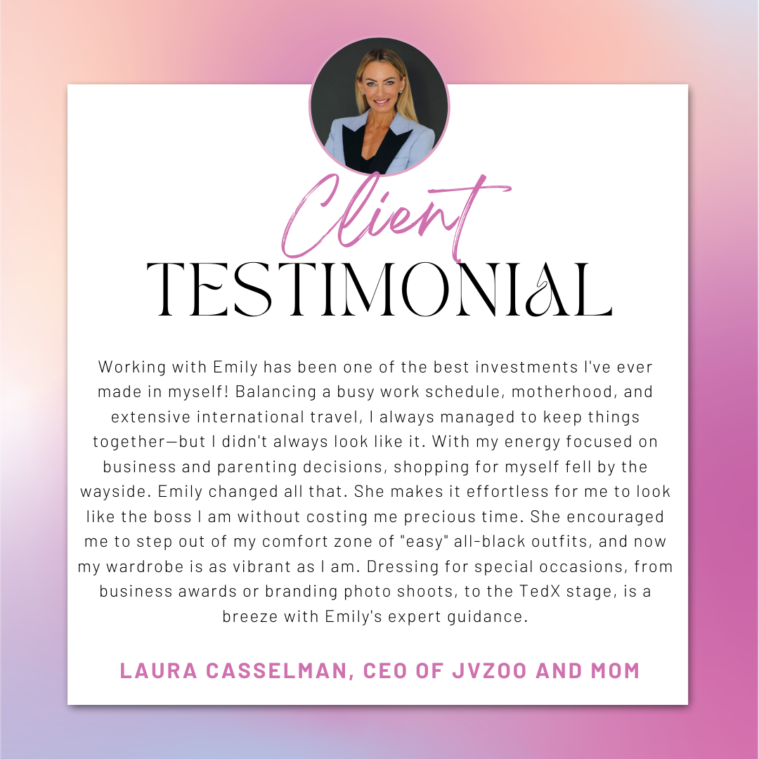 After the Closet Edit, which meticulously assess your current closet, Emily pinpoints strengths and identifies any gaps. Celebrate your new closet with 30 items added to your style board.